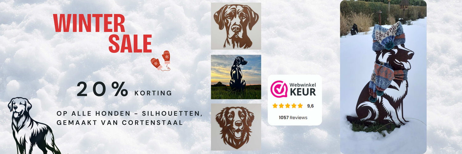 Onze metalen honden zijn gemaakt van duurzaam cortenstaal, dat een unieke patina ontwikkelt met de tijd, waardoor het een uniek kenmerk is van deze wanddecoratie. Het cortenstaal is bestand tegen weersomstandigheden en gemakkelijk te onderhouden.